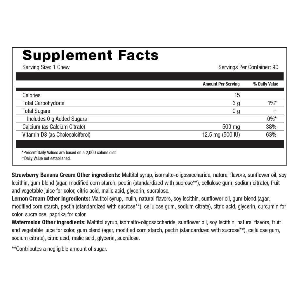 *To acquire the best absorption possible, take each calcium chew two hours apart from each other. Take two hours apart from any Iron supplement.